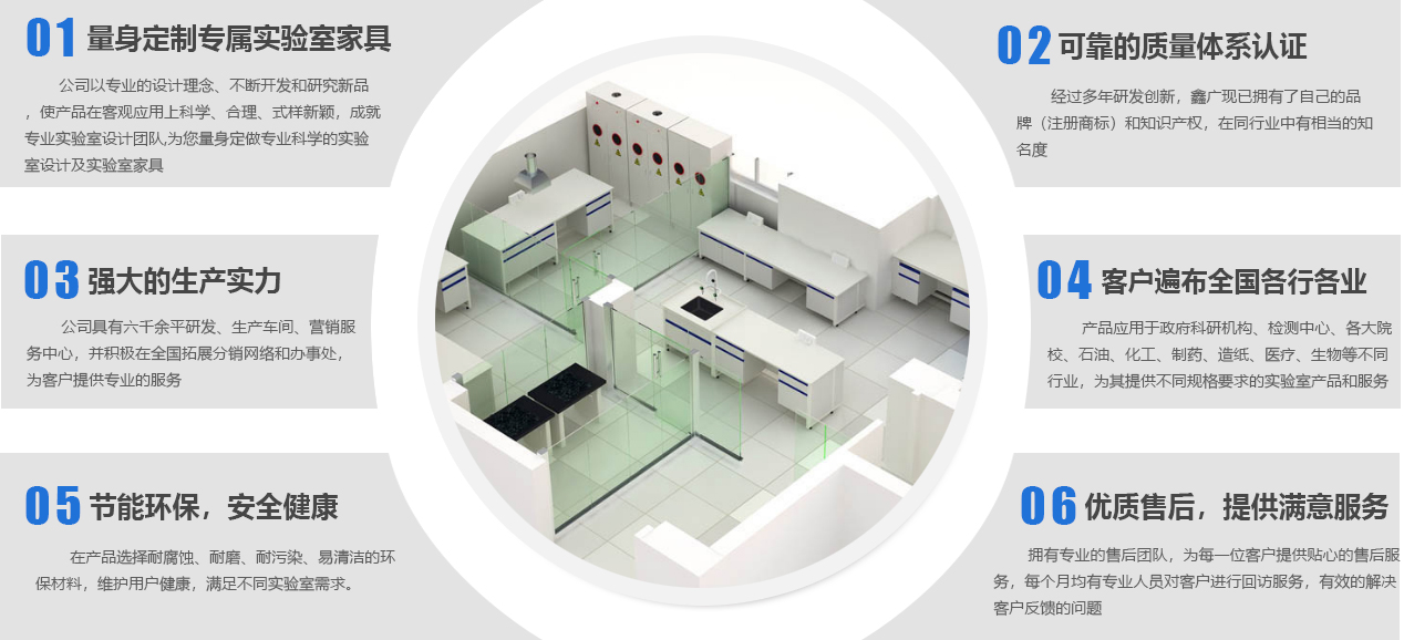 山東鑫廣實驗設備科技有限公司成立于2007年,是一家位于山東濰坊的實驗室家具工廠。作為實驗室整體解決方案服務商,我們提供從實驗室規(guī)劃、實驗室設計、實驗室裝修、實驗室工程、實驗室家具、實驗室設備、到實驗室服務等實驗室建造一站式服務,致力于專業(yè)研發(fā)、設計、生產(chǎn)實驗室家具等產(chǎn)品及相關(guān)配套設備,并提供實驗室建設全套解決方案的新型高科技企業(yè)。公司下設研發(fā)加工工廠、營銷服務中心,并積極在全國拓展分銷網(wǎng)絡和辦事處,為客戶提供更專業(yè)、優(yōu)良的產(chǎn)品和服務。